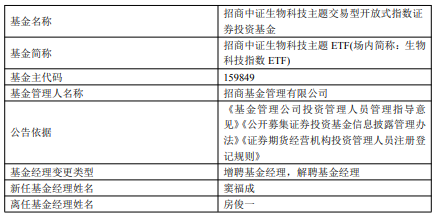 中国经济网北京12月16日讯 今日,招商基金公告,房俊一离任招商中证生物科技主题ETF、招商创业板大盘ETF,增聘窦福成管理。