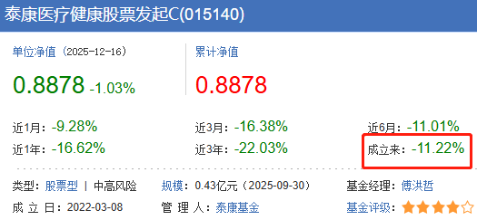 据悉,泰康医疗健康股票发起式A/C是泰康基金在2022年3月8日成立的股票型基金,从成立至今始终由傅洪哲单独管理。然而,面对2025年年内上证指数与创业板指数纷纷大涨超过14%和45%的牛市行情,该基金的两份额却在截至2025年12月16日分别下跌了13.43%和13.85%。