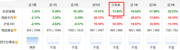 不仅如此,在成立至今的3年多里,该基金A/C份额的累计收益率也处于亏损状态,分别下跌9.54%和11.22%,累计单位净值仅有0.9046元、0.8878元。而且无论近3年、近2年、近1年,其排名均为不佳状态。