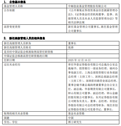 中国经济网北京12月17日讯 今日,中邮创业基金公告,任命张涛为董事长,原董事长毕劲松退休。