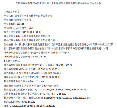 中国经济网北京12月18日讯 今日,信达澳亚基金管理有限公司发布信澳丰享利率债债券型证券投资基金基金合同生效公告。