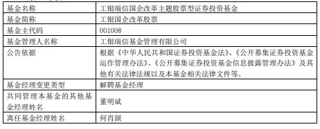 中国经济网北京12月18日讯 今日,工银瑞信基金公告,何肖颉离任工银国企改革股票,董明斌管理。