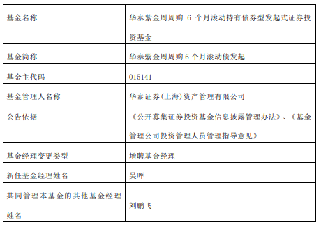 中国经济网北京12月18日讯 今日,华泰证券(上海)资产管理有限公司公告,华泰紫金周周购6个月滚动债发起增聘吴晖。