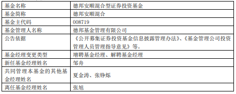 中国经济网北京12月19日讯 今日,德邦基金公告,德邦安顺混合增聘邹舟 张旭离任。