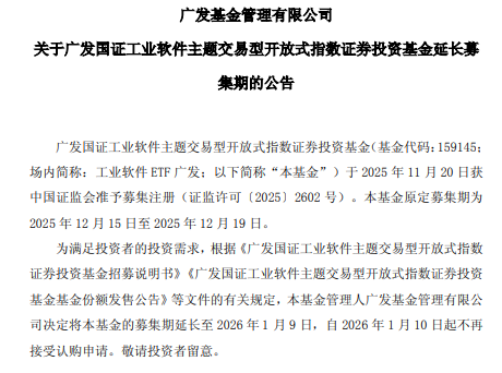 公告称,广发国证工业软件主题交易型开放式指数证券投资基金(基金代码:159145;场内简称:工业软件 ETF 广发;)于2025年11月20日获中国证监会准予募集注册(证监许可〔2025〕2602 号)。该基金原定募集期为2025年12月15日至2025年12月19日。现决定将该基金的募集期延长至2026年1月9日。