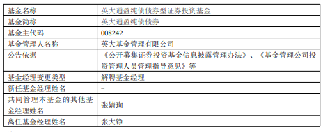 中国经济网北京12月22日讯 近日,英大基金公告,张大铮离任英大通盈纯债债券、英大安惠纯债。