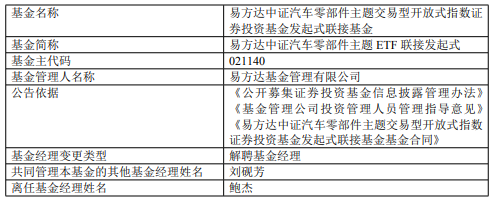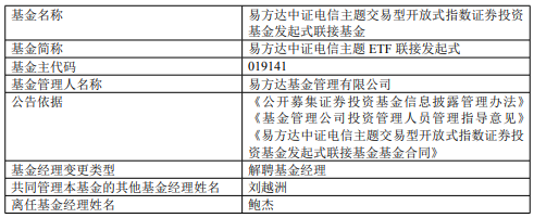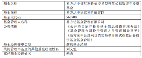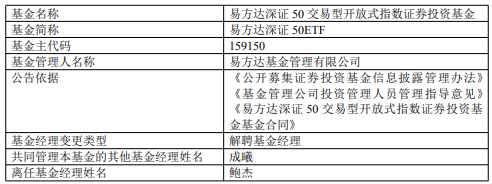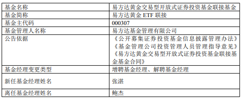 中国经济网北京12月22日讯 近日,易方达基金公告,鲍杰离任易方达中证红利价值ETF、易方达黄金 ETF 联接、易方达黄金ETF、易方达中证电信主题ETF、易方达中证电信主题ETF联接、易方达中证汽车零部件主题ETF联接发起式、易方达中证汽车零部件主题ETF、易方达中证港股通高股息投资指数发起式、易方达深证50ETF联接发起式、易方达深证50ETF。