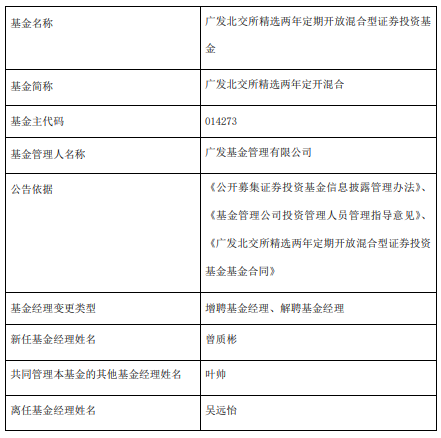 中国经济网北京12月23日讯 今日,广发基金公告,广发北交所精选两年定开混合增聘曾质彬,吴远怡离任。