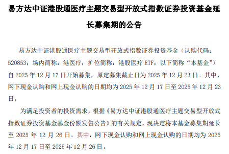 公告称,易方达中证港股通医疗主题交易型开放式指数证券投资基金(认购代码:520853;场内简称:港医疗;扩位简称:港股医疗ETF)自2025年12月17日开始募集,原定募集截止日为2025年12月23日。其中,网下现金认购和网上现金认购的日期均为2025年12月17日至2025年12月23日。现决定将该基金募集期延长至2025年12月26日。其中,网下现金认购和网上现金认购的日期均为2025年12月17日至2025年12月26日。