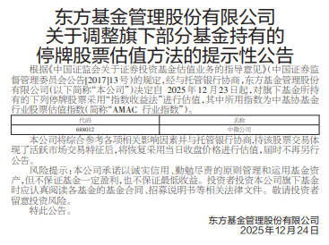公告称,根据《中国证监会关于证券投资基金估值业务的指导意见》(中国证券监督管理委员会公告[2017]13号)的规定,经与托管银行协商,东方基金管理股份有限公司决定自2025年12月23日起,对旗下基金所持有的中微公司采用“指数收益法”进行估值,其中所用指数为中基协基金行业股票估值指数(简称“AMAC 行业指数”)。