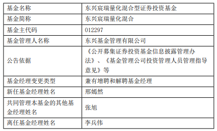 中国经济网北京12月26日讯 今日,东兴基金公告,东兴宸瑞量化混合增聘邢嫣然,李兵伟离任。