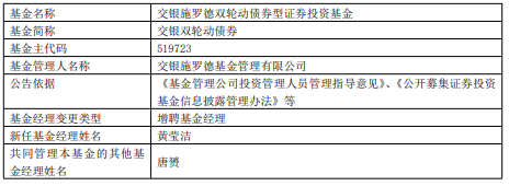中国经济网北京12月29日讯 近日,交银施罗德基金公告,交银双轮动债券增聘黄莹洁。