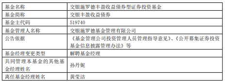 中国经济网北京12月29日讯 近日,交银施罗德基金公告,黄莹洁离任交银丰盈收益债券。