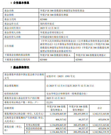 中国经济网北京1231日讯 今日,华夏基金发布华夏沪深300指数量化增强型证券投资基金基金合同生效公告。