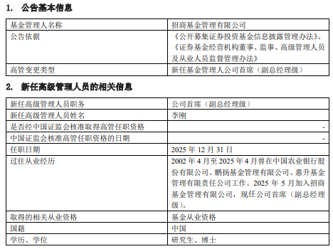 中国经济网北京12月31日讯 今日,招商基金公告,任命李刚为公司首席(副总经理级)。
