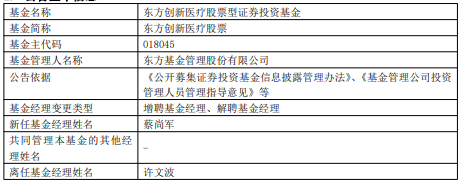 中国经济网北京12月31日讯 今日,东方基金公告,东方创新医疗股票增聘蔡尚军,许文波离任。