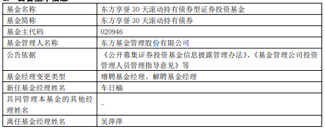 中国经济网北京12月31日讯 今日,东方基金公告,东方享誉30天滚动持有债券增聘车日楠,吴萍萍离任。