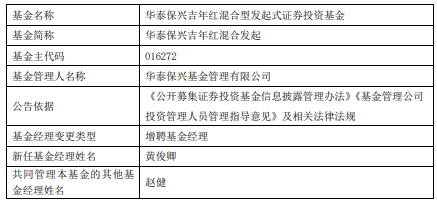 中国经济网北京1月5日讯 近日,华泰保兴基金公告,华泰保兴吉年红混合发起增聘黄俊卿。