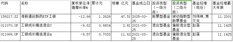工银国证港股通创新药ETF由基金经理刘伟琳、焦文龙共同管理,工银成长精选混合A/C由基金经理赵蓓管理。截至去年三季度末,工银国证港股通创新药ETF的规模为47.51亿元,工银成长精选混合A/C的规模为14.44亿元。