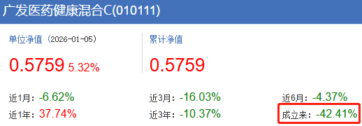 2025年三季报显示,广发医药健康混合前十大重仓股为科伦博泰生物、信达生物、荣昌生物、三生制药、百利天恒、荣昌生物、恒瑞医药、药明康德、泽璟制药、信立泰。该基金不仅在去年12月份业绩不佳,从2020年10月21日成立至今的5年多时间里,该基金A/C份额分别遭遇41.19%和42.41%的跌幅。
