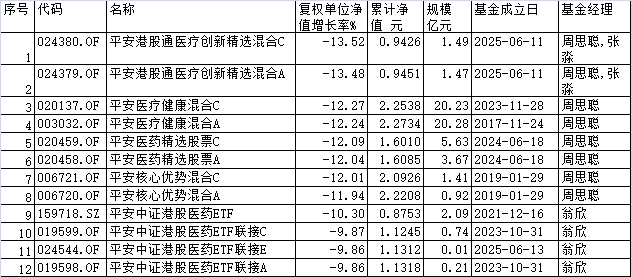 此外,翁欣管理的4只指数型基金平安中证港股医药ETF、平安中证港股医药ETF联接C、平安中证港股医药ETF联接E、平安中证港股医药ETF联接A跌幅也均超过9%。