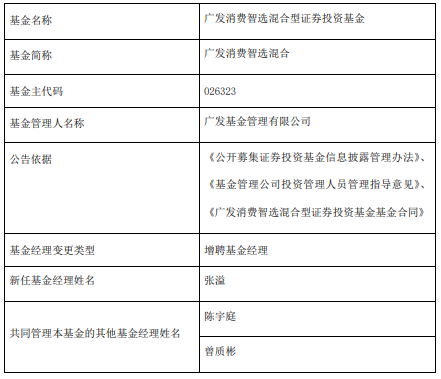 中国经济网北京1月7日讯 今日,广发基金公告,广发消费智选混合增聘张溢。