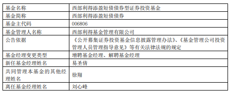 中国经济网北京1月8日讯 今日,西部利得基金公告,西部利得添盈短债债券增聘易圣倩,刘心峰离任。