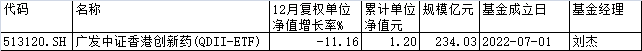 中国经济网北京1月8日讯 据同花顺数据显示,在刚过去的2025年12月份,广发中证香港创新药(QDII-ETF)单月下跌11.16%。截至2025年三季度末规模为138.75亿元。