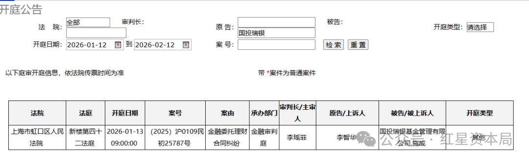 今日上午9时,国投瑞银基金管理有限公司及其基金经理施成因涉“金融委托理财合同纠纷”,被一名投资者作为共同被告提起诉讼,该案于上海市虹口区人民法院新楼第四十二法庭进行庭前会议。