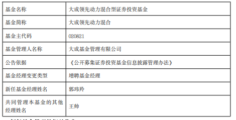 中国经济网北京1月14日讯 今日,大成基金公告,大成领先动力混合、大成互联网思维混合、大成科创主题混合(LOF)增聘郭玮羚。