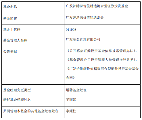 中国经济网北京1月14日讯 今日,广发基金公告,广发沪港深价值精选混合增聘王丽媛。