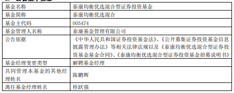 中国经济网北京1月15日讯 今日,泰康基金公告,桂跃强离任泰康均衡优选混合,陈鹏辉管理。