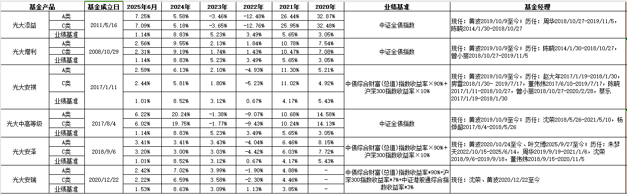排名来源于银河证券,截至2025.12.31。近两年7只产品跻身前10%具体数据分别为:光大产业新动力A排名23/407,同类为灵活配置型基金;光大中高等级A排名1/245,同类为普通债券型基金(可投转债);光大添益A排名12/433,同类为普通债券型基金(二级);光大晟利A排名13/245,同类为普通债券型基金(可投转债);光大安诚A排名35/433,同类为普通债券型(二级);光大恒鑫A排名22/248,同类为普通偏债型基金(股票上限高于30%);光大增利A排名17/245,同类为普通债券型基金(可投转债)。