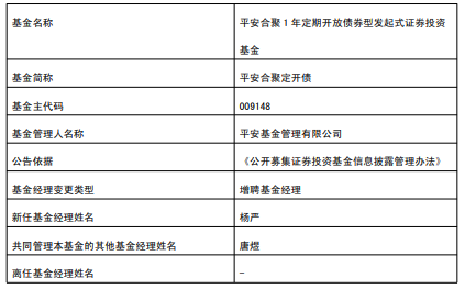 中国经济网北京1月20日讯 今日,平安基金公告,平安合聚定开债、平安惠安纯债、平安惠轩纯债、平安惠润纯债增聘杨严。
