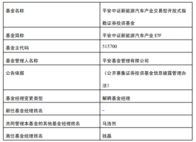 中国经济网北京1月20日讯 今日,平安基金公告,钱晶离任平安中证新能源汽车ETF发起联接、平安中证新能源汽车产业ETF、平安中证汽车零部件主题ETF。
