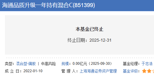 截至2025年12月31日最后一次披露净值日,海通品质升级一年持有混合A/C的累计单位净值为2.6425元、2.5948元,累计收益率为-20.28%、-21.72%。