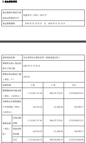 募集期间净认购金额2,703,028,873.21元,认购资金在募集期间产生的利息549,396.77元,募集份额合计2,703,578,269.98份。