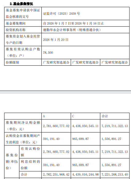 募集期间净认购金额7,219,711,322.13元,认购资金在募集期间产生的利息1,556,891.27元,募集份额合计7,221,268,213.40份。
