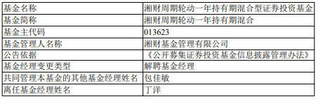 中国经济网北京1月21日讯 今日,湘财基金公告,丁洋离任湘财周期轮动一年持有期混合。