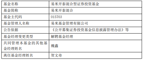 中国经济网北京1月21日讯 今日,易米基金公告,贺文奇离任易米开泰混合。