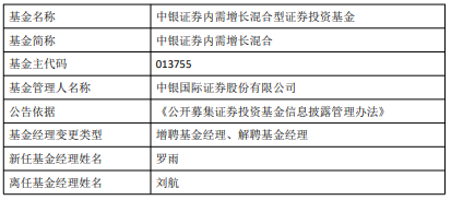 中国经济网北京1月21日讯 今日,中银国际证券股份有限公司公告,中银证券内需增长混合增聘罗雨,刘航离任。