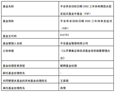 中国经济网北京1月22日讯 今日,平安基金公告,高莺离任平安养老目标日期2050三年持有发起式(FOF),王家萌管理。