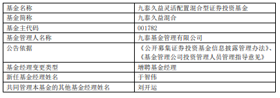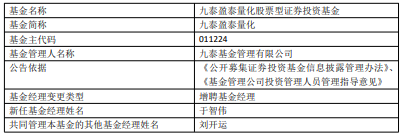 中国经济网北京1月22日讯 昨日,九泰基金公告,九泰盈泰量化、九泰久益混合增聘于智伟。