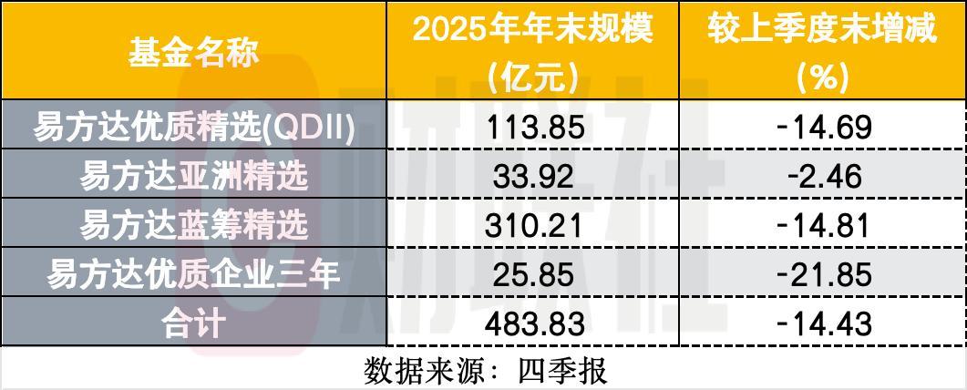 截至去年年末,张坤旗下4只产品在管规模合计483.83亿元,较同年三季度末的565.43亿元,规模减少81.6亿元,减幅为14.43%。4只产品规模环比均有下滑,易方达优质企业三年、易方达蓝筹精选、易方达优质精选(QDII)、易方达亚洲精选较上期分别减少21.85%、14.81%、14.69%、2.46%。