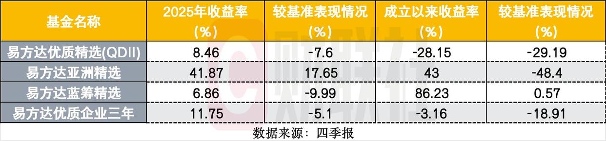 过去一年,易方达优质精选(QDII)、易方达亚洲精选、易方达蓝筹精选、易方达优质企业三年的二季度收益率分别为8.46%、41.87%、6.86%、11.75%。除了易方达亚洲精选跑赢基准17.65%,其余同期业绩均低于基准。