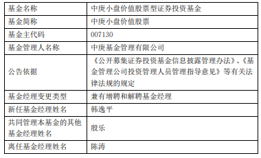 中国经济网北京1月23日讯 今日,中庚基金公告,中庚小盘价值股票增聘韩逸平,陈涛离任。