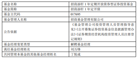 中国经济网北京1月23日讯 今日,招商基金公告,刘万锋离任招商添轩1年定开债,丁悦成管理。