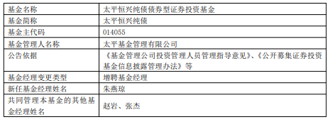 中国经济网北京1月23日讯 今日,太平基金公告,太平恒兴纯债增聘朱燕琼。
