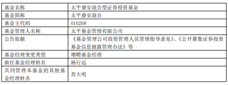 中国经济网北京1月23日讯 今日,太平基金公告,太平睿安混合增聘杨行远。