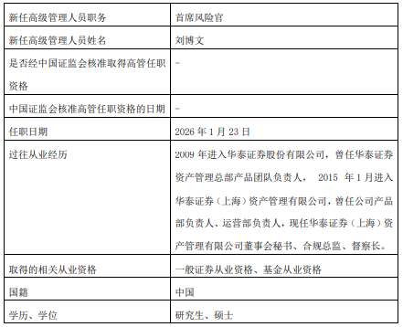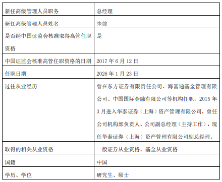 中国经济网北京1月26日讯 近日,华泰证券(上海)资产管理有限公司任命原总经理江晓阳为董事长;原副总经理朱前为总经理。任命刘博文为首席风险官,原首席风险官覃洁离任。